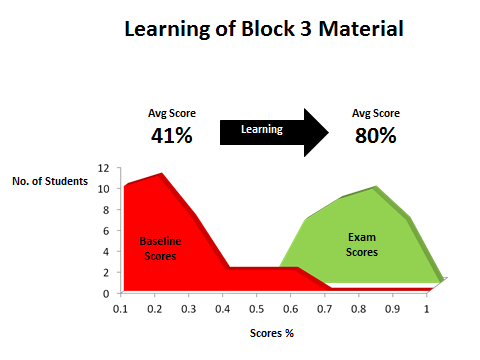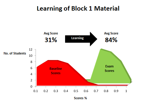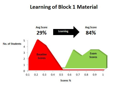 The charts below display student performance data from University level courses. Students were evaluated at the beginning of the semester (red distributions “Baseline Scores”), where any knowledge would have come from independent study or prior experience.